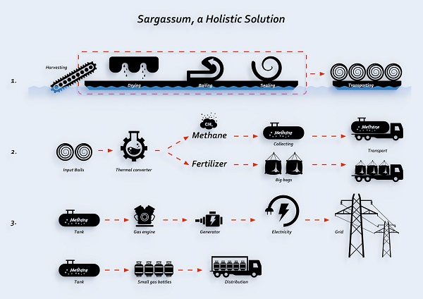 The consortium aims to collect and purify Sargassum, then turn it into biogas via a two-step process using low temperature anaerobic digestion as the first step. The residues of this process will then be fed into a high temperature anaerobic thermal reactor to turn them into usable methane.