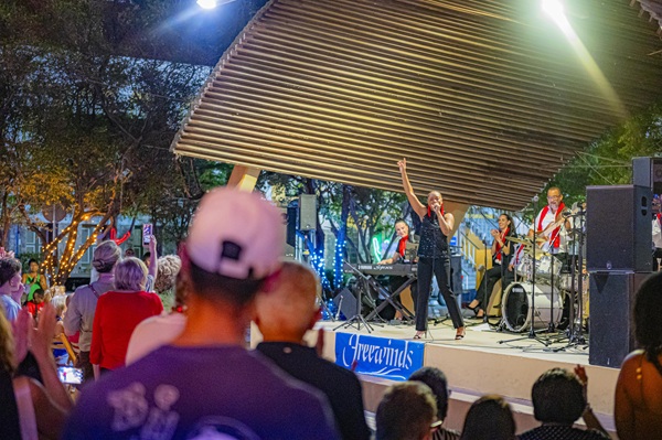 The open-air concert brought together residents and visitors for an evening of holiday music and celebration in the heart of the city. Performers Jodi, Kadir, and Michele took the stage, entertaining the audience with a wide selection of Christmas songs performed from the beginning to the end of the program.