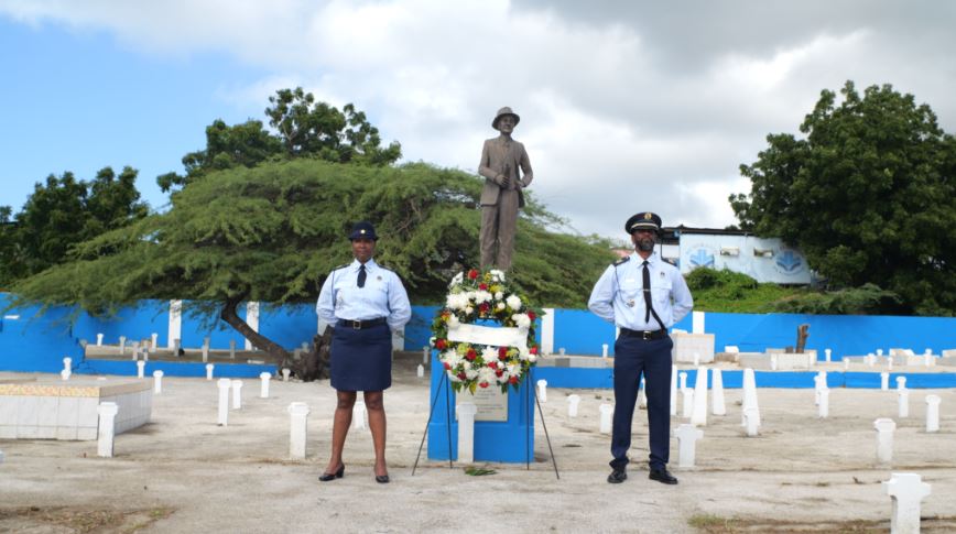 WILLEMSTAD - During his first official visit to Curaçao, the President of the Republic of Suriname, His Excellency Chandrikapersad Santokhi, laid a wreath today at the statue of Surinamese labor leader and social activist Louis Alfred Gerardus Doedel. The ceremony took place at the national monument in Kolebra Bèrdè, with Doedel's descendants in attendance.