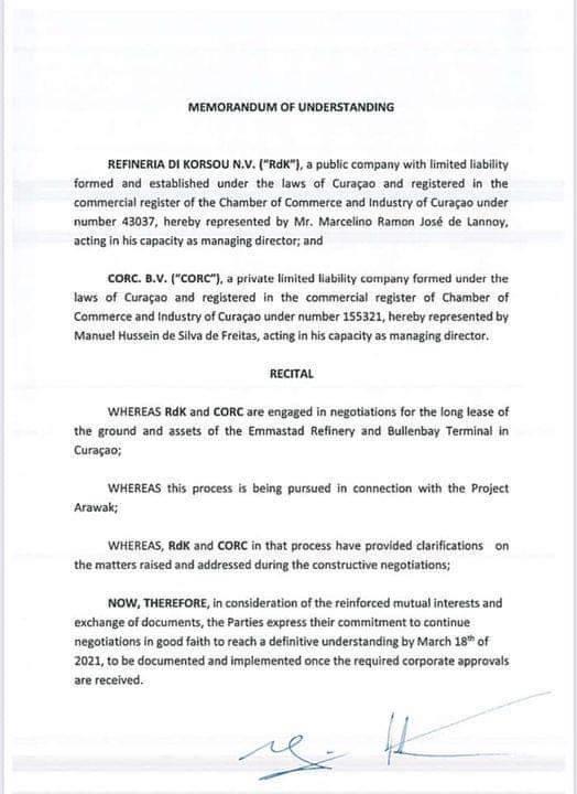 WILLEMSTAD - In a press release, the Curaçao Refinery (RdK) and the Curaçao Oil Refinery Complex (CORC) announced that they have taken a step closer to reaching an agreement with the signing a Memorandum of Understanding (MoU). This specific step marks the beginning of the final negotiation phase.