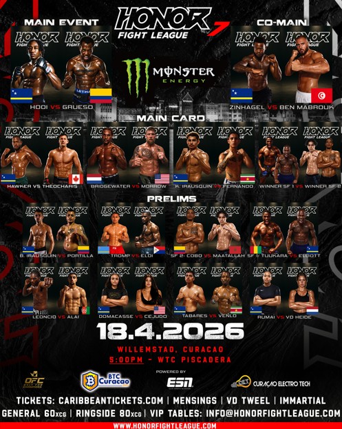 WILLEMSTAD – The official draw for the four-man tournament at Honor Fight League #7 has been completed, setting the stage for an international showdown during one of the most ambitious fight cards ever organized on Curaçao.