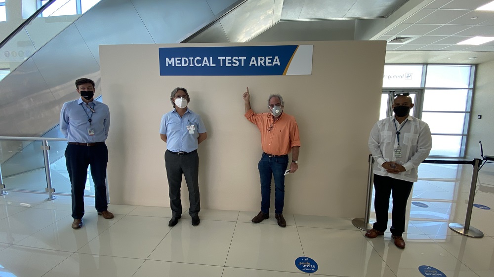 Photo: (from left to right) Mr. Paulo Mazzali - co-CEO CAP, Dr. Alcalá - Epidemiology & Research Unit, Ministry of Health of Curaçao, Dr. Izzy Gerstenbluth - Epidemiology & Research Unit, Ministry of Health of Curaçao, Mr. Josiah Arndell - Coordinator Airside Operations