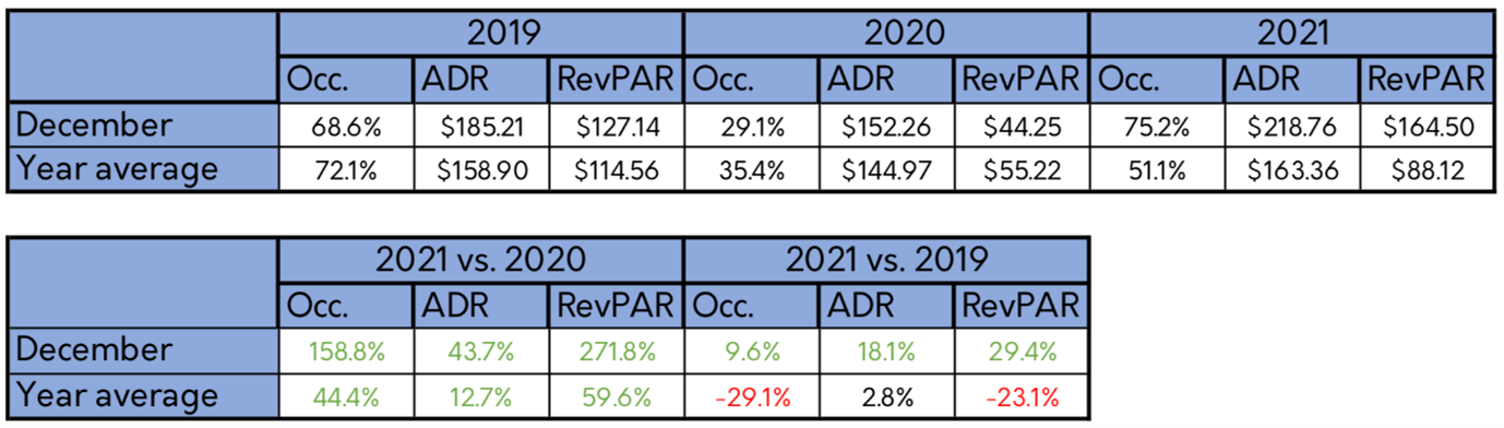 The overall hotel performance for 2021, despite the bad performance of the first half of the year, clearly increased compared to 2020 as well as monthly and even compared to pre-covid data from 2019. The overall average occupancy for 2021 was 51.1%. Compared to the overall 2020 occupancy (35.4%) this is an increase of 44.4%. The average daily rate of 2021 was $163.36. Compared to 2020, this is an increase of 12.7%. As for the overall average revenue per available room, in 2021 this was $88.12 which is an increase of 59.6% compared to 2020.