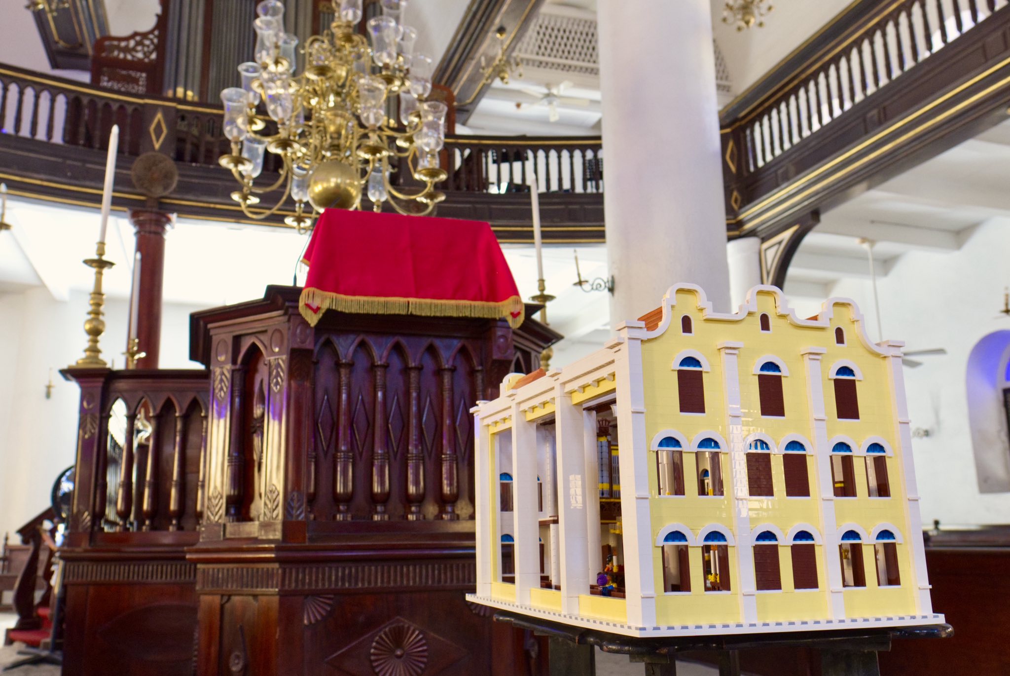 The synagogue, built in 1732, is the oldest synagogue in continuous use in the Western Hemisphere. Numann has a personal connection to the building, having lived on Curaçao as a child and celebrated his bar mitzvah at the synagogue. He described the Snoa as “love at first sight,” pointing to its yellow exterior walls, white sand floor, blue window frames, mahogany interior, and distinctive chandeliers and organ as defining features he sought to recreate in the model.